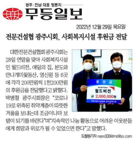 HOME > KOSCA광주 소개 > 전문건설협 광주시회, 사회복지시설 후원금 전달(무등일보) > 보도자료