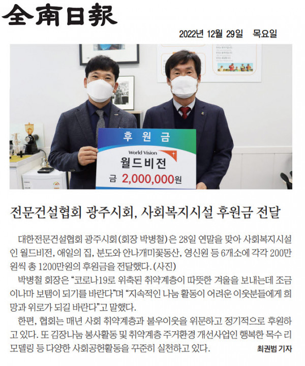 전문건설협회 광주시회, 사회복지시설 후원금 전달(전남일보)