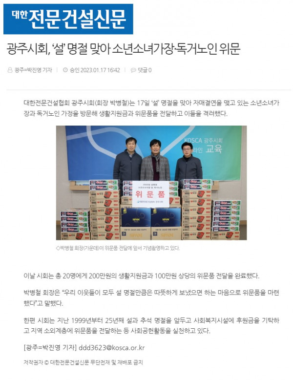 HOME > KOSCA광주 소개 > 광주시회, \'설\'명절 맞아 소년소녀가장·독거노인 위문(대한전문건설신문) > 보도자료