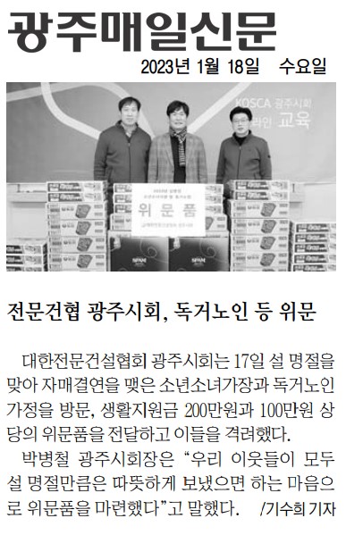 HOME > KOSCA광주 소개 > 전문건협 광주시회, 독거노인 등 위문(광주매일신문) > 보도자료