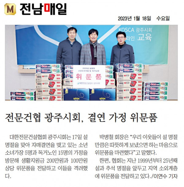 HOME > KOSCA광주 소개 > 전문건협 광주시회, 결연 가정 위문품(전남매일) > 보도자료