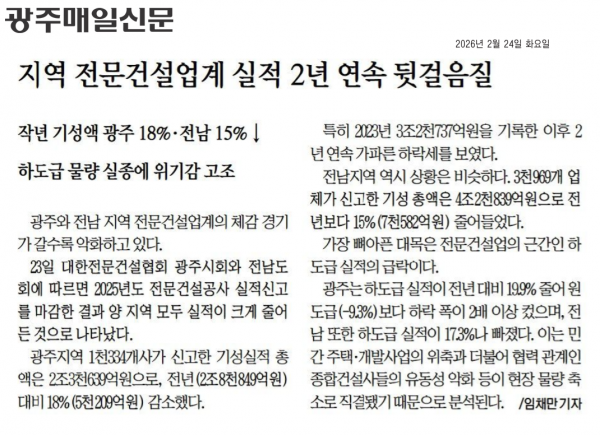 지역 전문건설업계 실적 2년 연속 뒷걸음질 (광주매일신문)