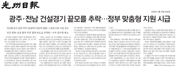 광주.전남 건설경기 끝모를 추락...정부 맞춤형 지원 시급 (광주일보) 페이지 정보 작성자 전문건설협회광주광역시회 댓글 0건 조회 299회 작성일 2026-02-24 09:08 목록 본문