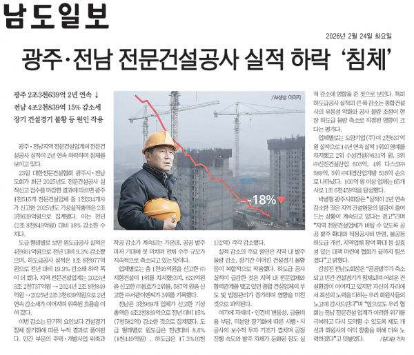 HOME > KOSCA광주 소개 > 광주.전남 전문건설공사 실적 하락 \'침체\' (남도일보) > 보도자료