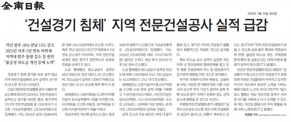 '건설경기 침체' 지역 전문건설공사 실적 급감 (전남일보)